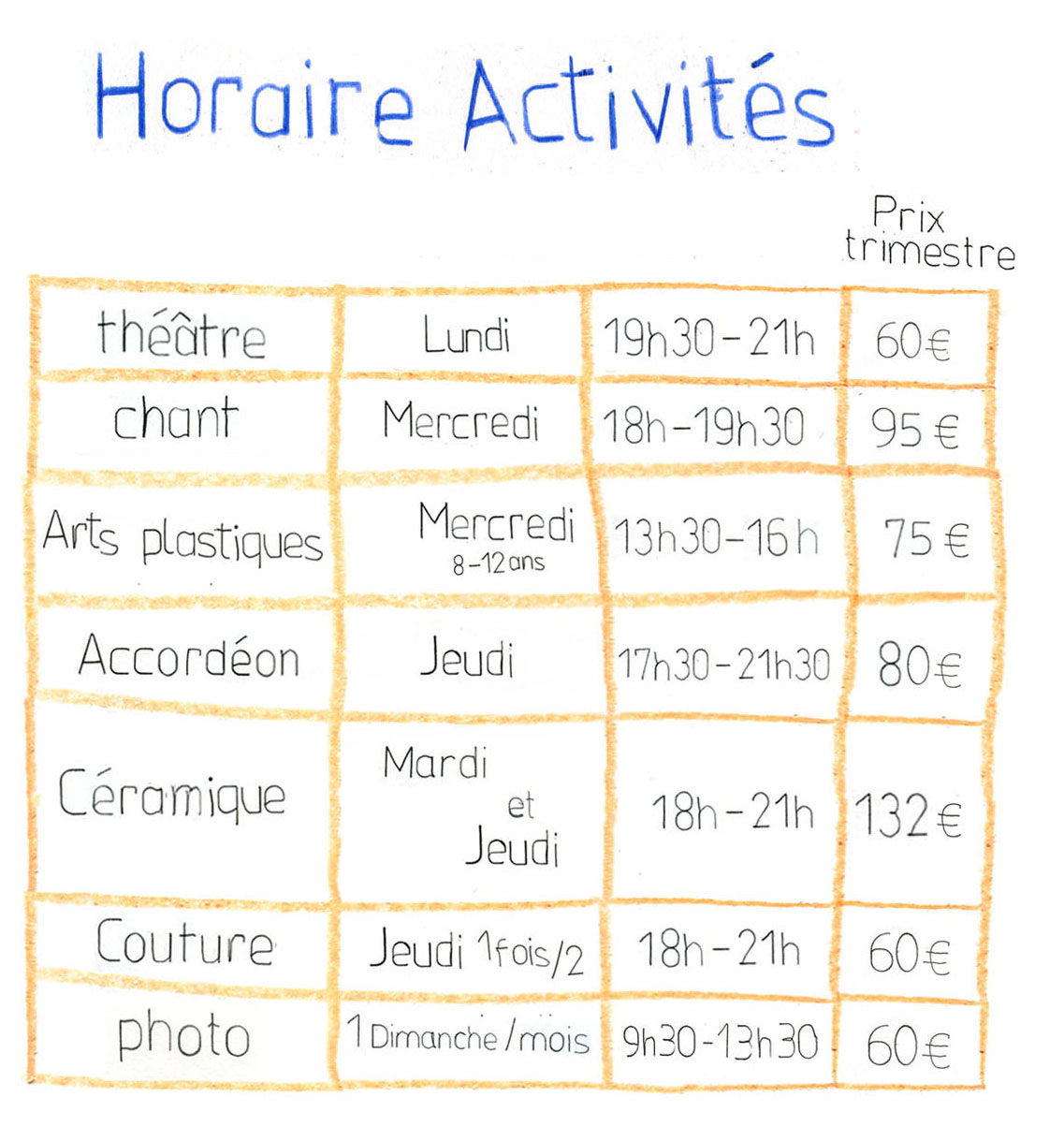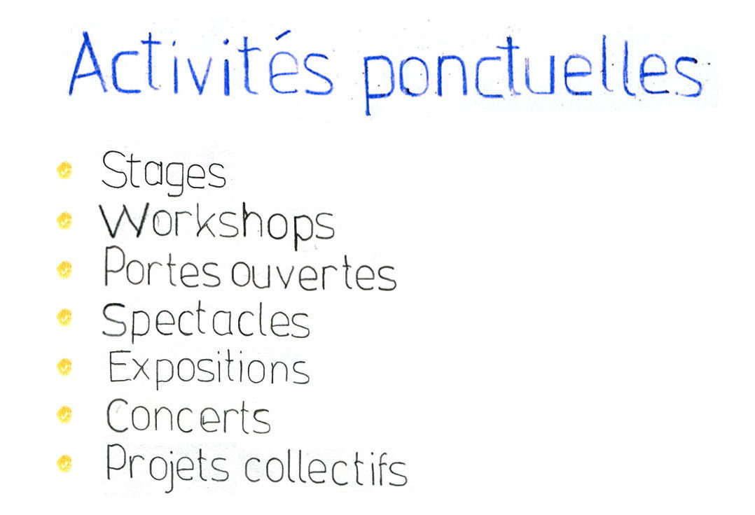 A travers nos activités, nous visons à développer l’imaginaire, la sensibilité, l’échange, les découvertes culturelles et citoyennes. Les ateliers sont des espaces de création individuels et collectifs où la technique n’est pas une fin en soi et où l’on valorise le trajet réalisé.